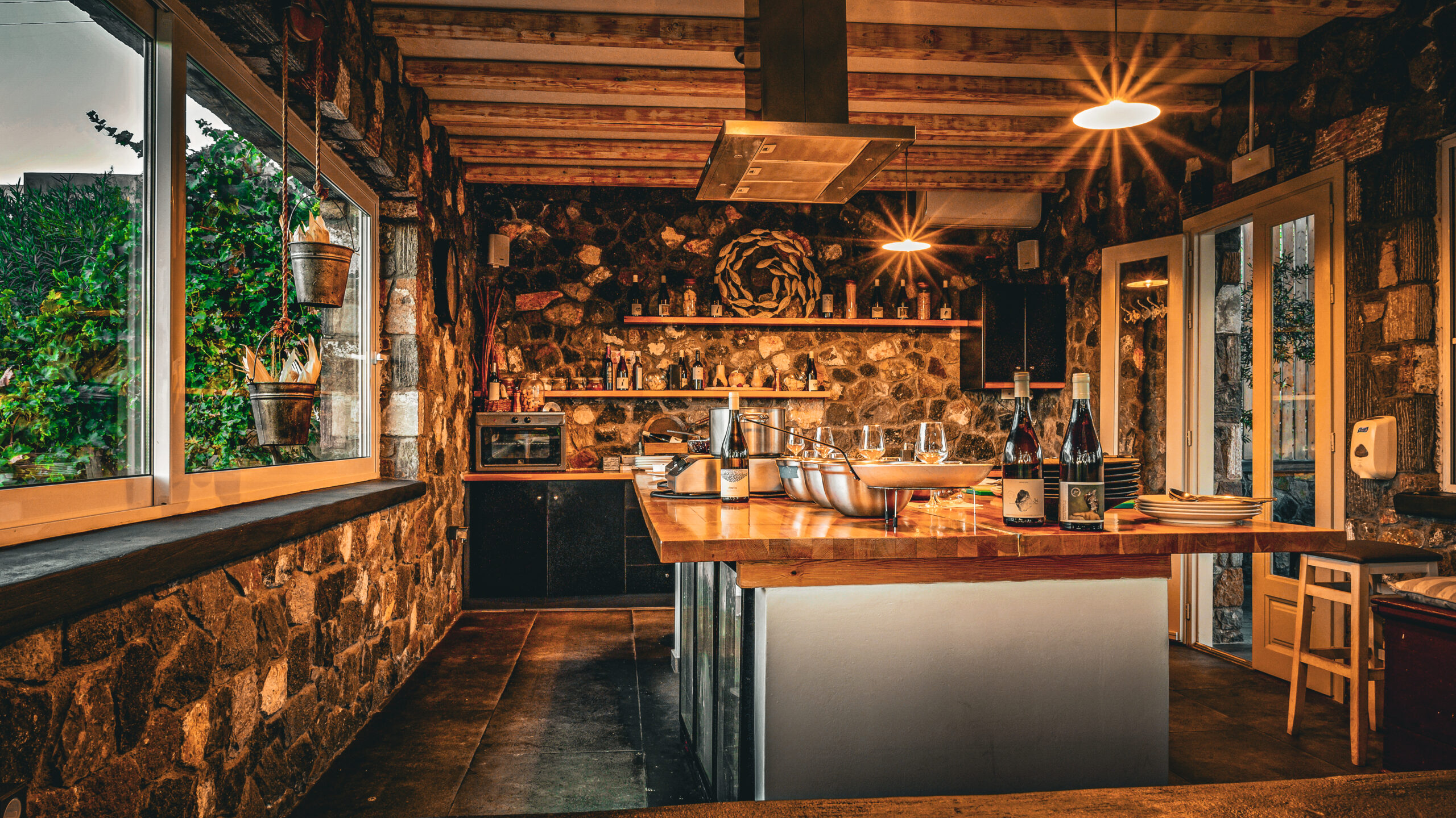 At Aroma Avlis, the restaurant of Artemis Karamolegos Winery, guests gather around a communal table to cook traditional Santorinian dishes with seasonal ingredients from the estate and nearby farms. The experience is led by Margarita Karamolegou, from one of the island’s most respected winemaking families — known for over 20 years of crafting Assyrtiko wines that reflect Santorini’s volcanic terroir.